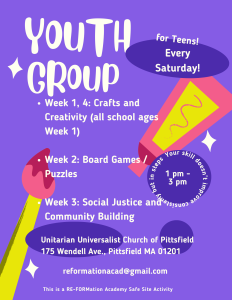 Our Teen Youth Group is run by Tina Cardot of RE-FORMation Academy, and meets from 1pm to 3pm in our Youth/Adult Lounge on the 2nd floor landing. See the graphic below for details, and feel free to email Alexander, our Director of Operations, with any questions.